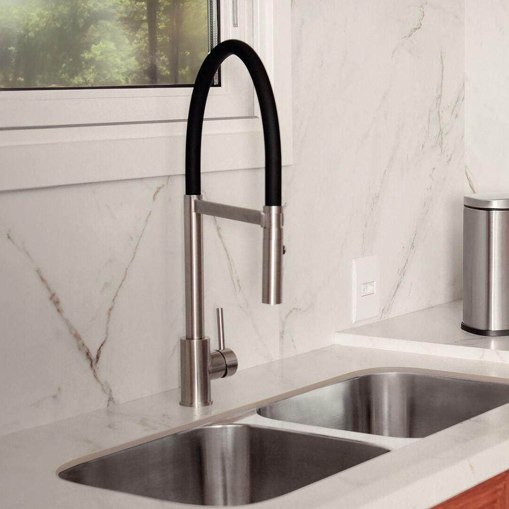 O contraste entre o brilho profundo do inox acetinado e o preto absoluto do silicone eleva o valor visual do projeto, conferindo uma personalidade única ao ambiente.