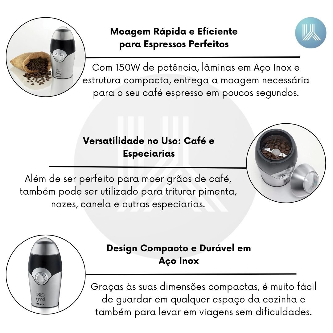Com 150W de potência, o Moedor de Café Pro Grind entrega a moagem necessária para o seu café espresso em poucos segundos. Suas lâminas de aço inoxidável de estrutura compacta garantem que o café seja moído de forma rápida e eficiente, permitindo que você desfrute do máximo frescor, com o aroma dos grãos moídos na hora, todos os dias.