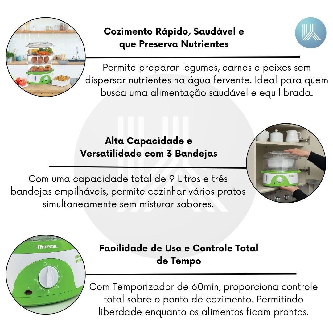 Não tem segredos, sendo perfeito para cozinhar peixes, mariscos, vegetais e até carnes, garantindo pratos leves e nutritivos. Ao manter os componentes aromáticos e a consistência dos alimentos, esta Panela a Vapor Elétrica Ariete oferece uma alternativa mais saborosa e funcional à cozinha tradicional.