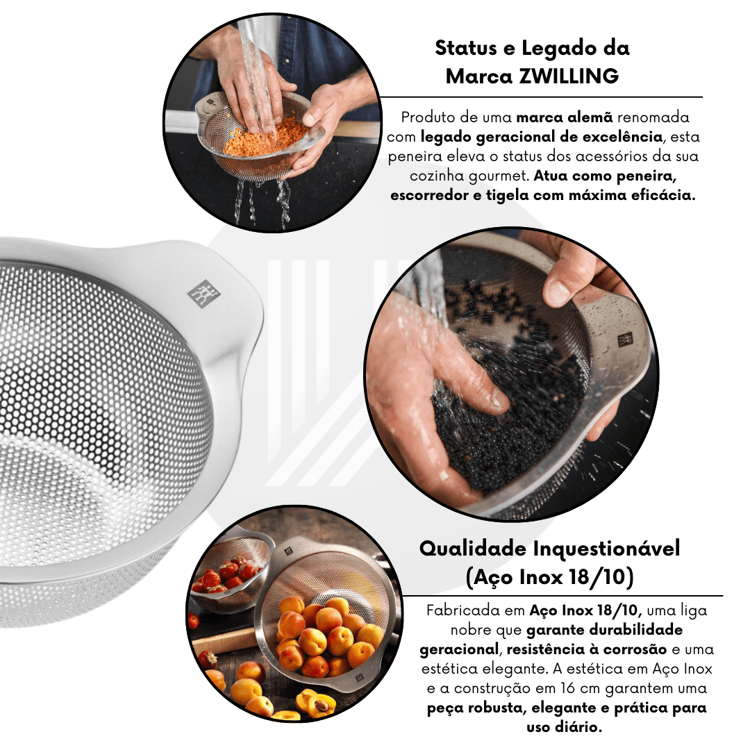 Status e Legado da Marca ZWILLING: Produto de uma marca alemã renomada com legado de excelência, esta peneira eleva o status dos acessórios da sua cozinha gourmet.