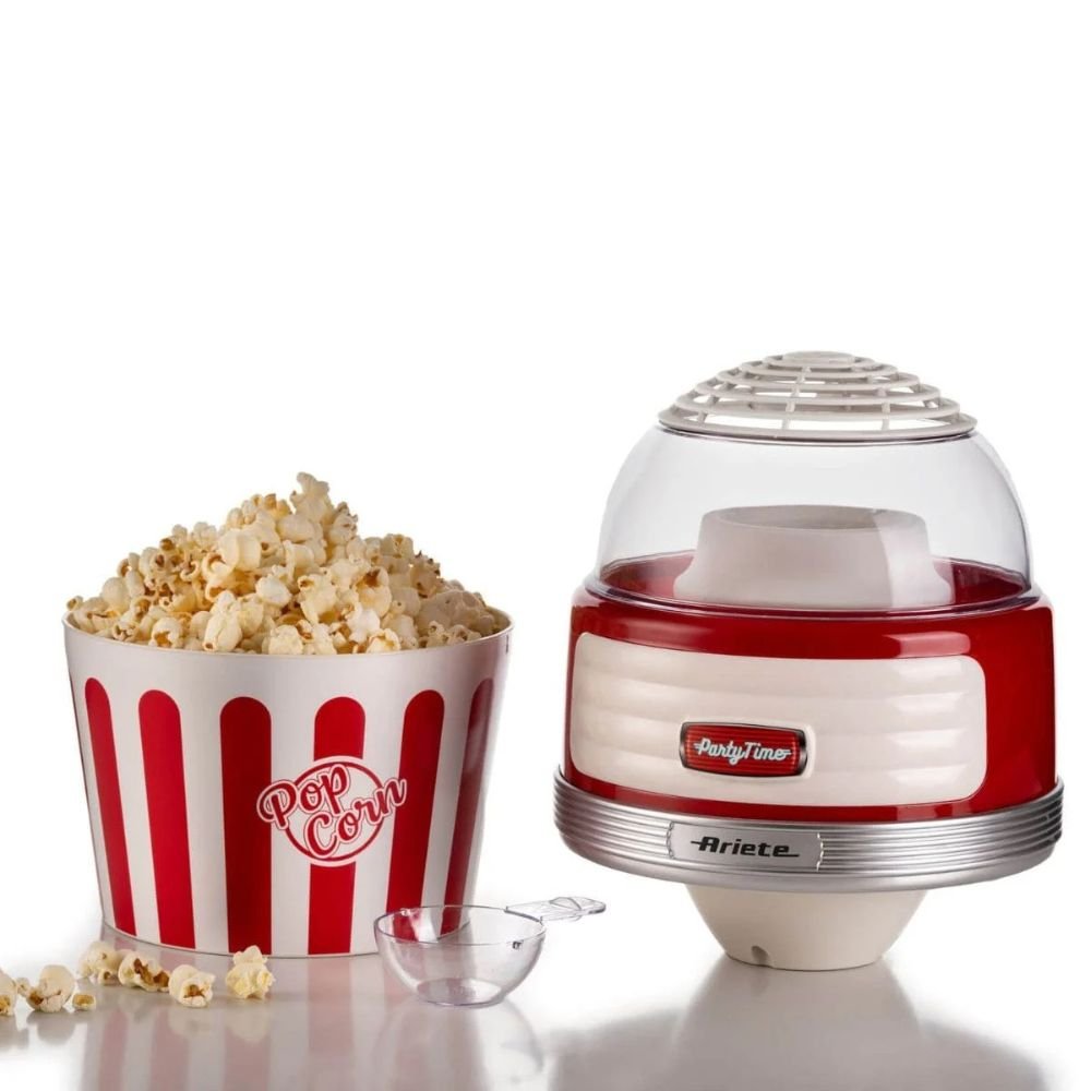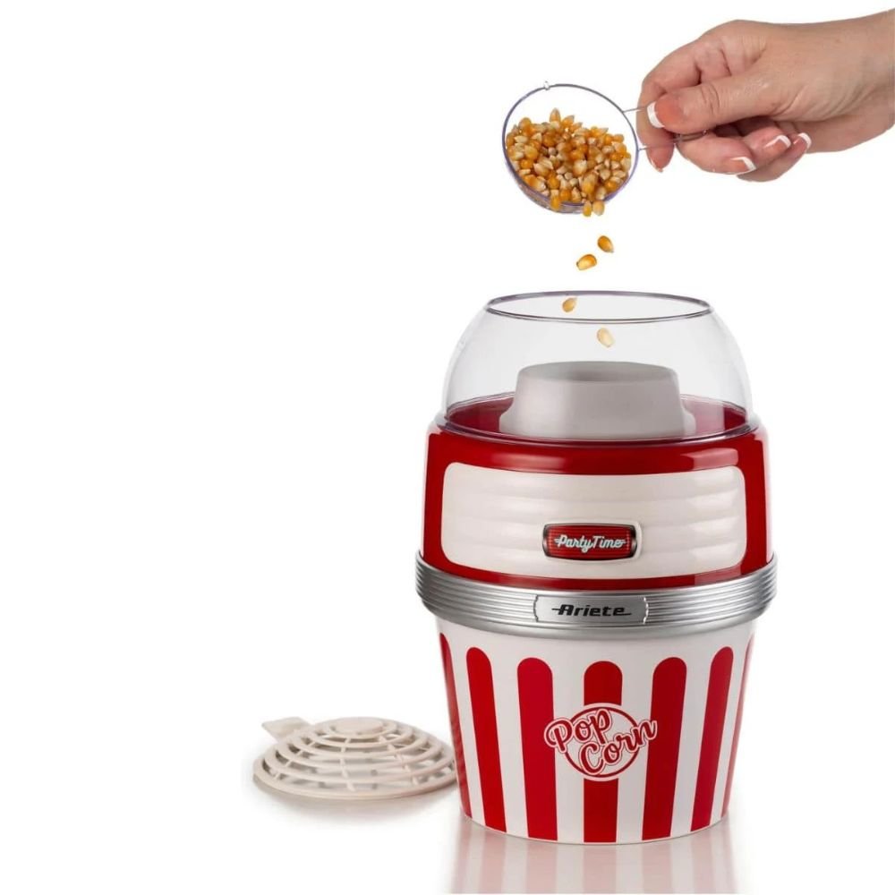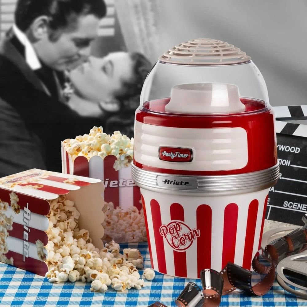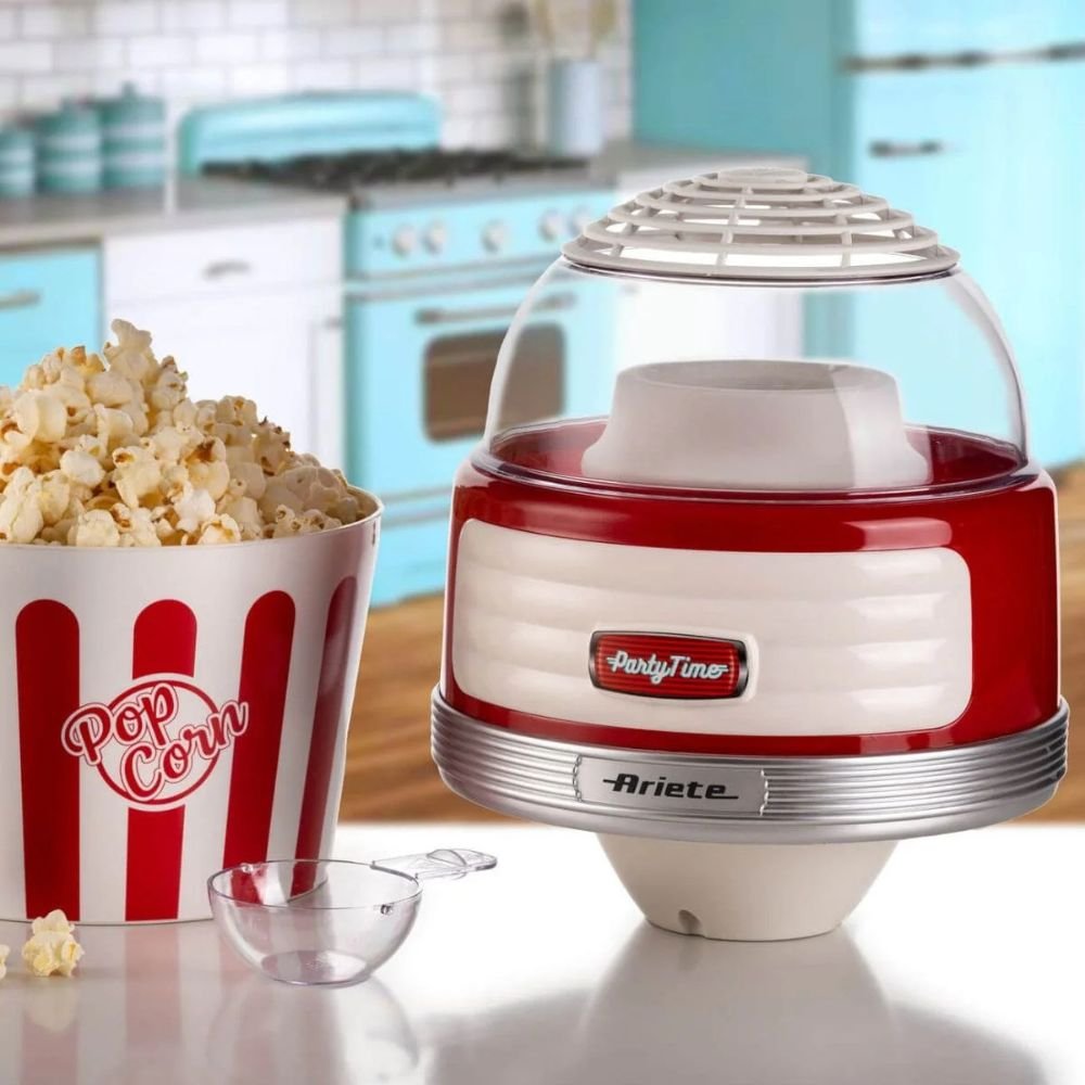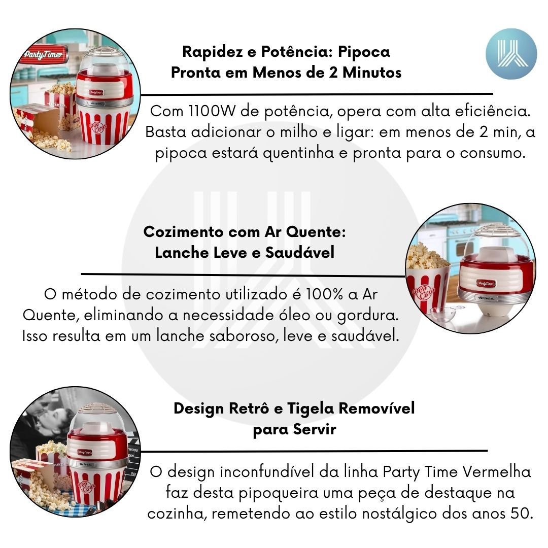 Sinta o aroma e ouça o estalo da perfeição com a Pipoqueira Ariete 2957 Retrô Party Time. Traga o charme dos Happy Days americanos dos anos 1950 para a sua casa, transformando qualquer noite em família em uma festa. Com 1100W de potência, o método especial de cozimento a Ar Quente garante que 60g de milho se tornem pipocas crocantes e apetitosas em menos de 2 minutos. É o lanche ideal, totalmente natural, leve e sem adição de óleo, nem gordura.