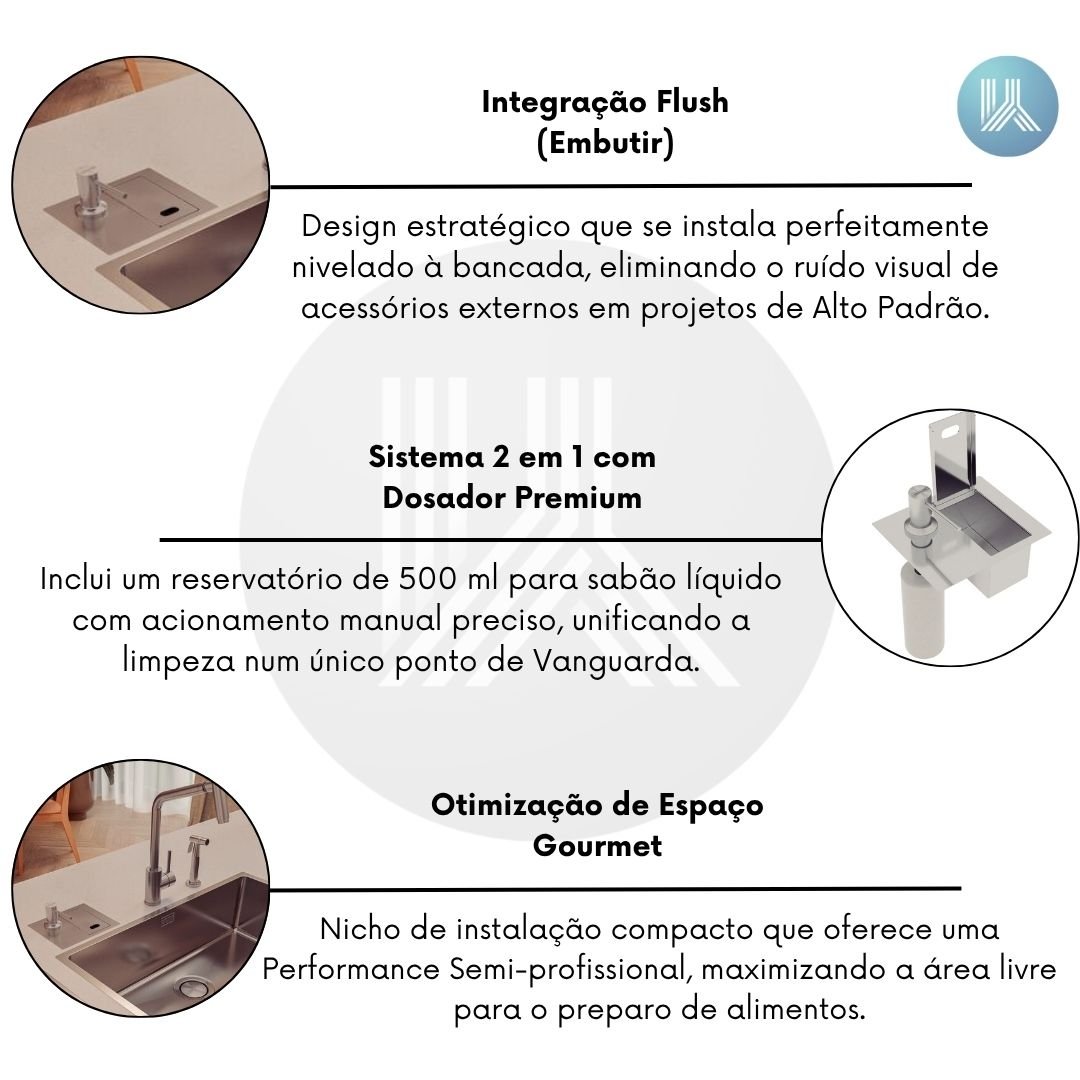 Design estratégico que se instala perfeitamente nivelado à bancada, eliminando o ruído visual de acessórios externos em projetos de Alto Padrão.
