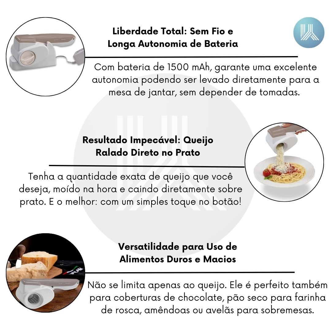 Oferece a liberdade de ser levado diretamente para a mesa de jantar ou bancada, sem depender de tomadas. Sua bateria de 1500 mAh garante uma excelente autonomia, sendo capaz de ralar até 1kg de queijo por carga. A praticidade do design portátil e a longa duração fazem dele um aliado indispensável.