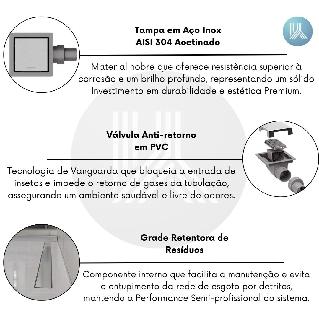 Estrutura projetada para garantir a estanqueidade perfeita entre o ralo e o piso, protegendo a estrutura da obra em projetos de Alto Padrão.