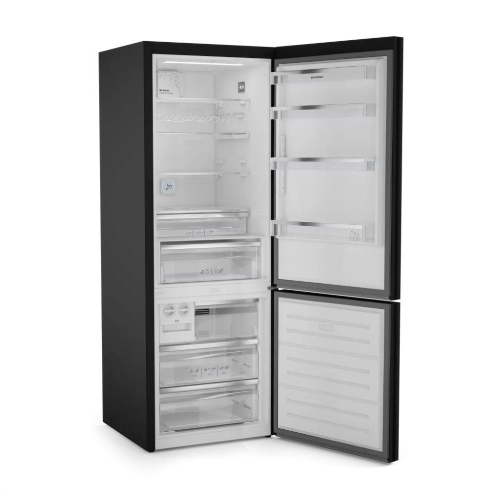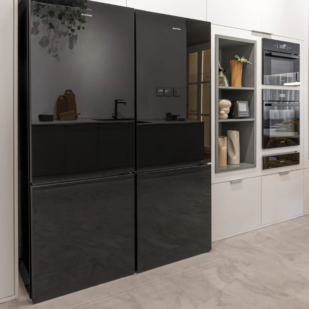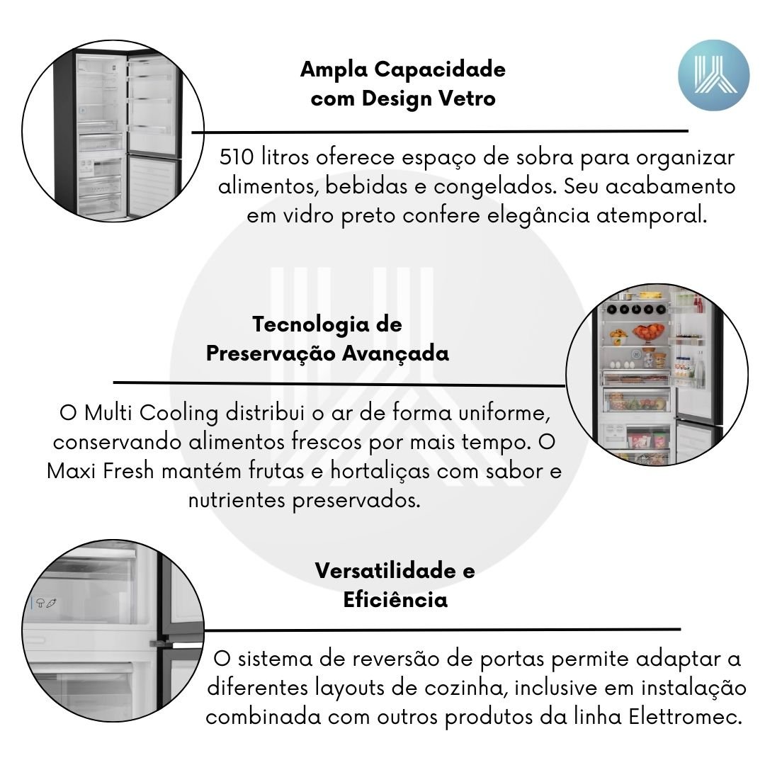 O Refrigerador Vetro Bottom Freezer 510 litros da Elettromec combina design sofisticado, ampla capacidade e tecnologias de preservação avançadas. Com acabamento em vidro preto e puxador minimalista, se integra facilmente a diferentes estilos de cozinha, oferecendo eficiência energética e praticidade no uso diário. É a solução perfeita para quem busca armazenamento generoso com sofisticação de alto padrão.
