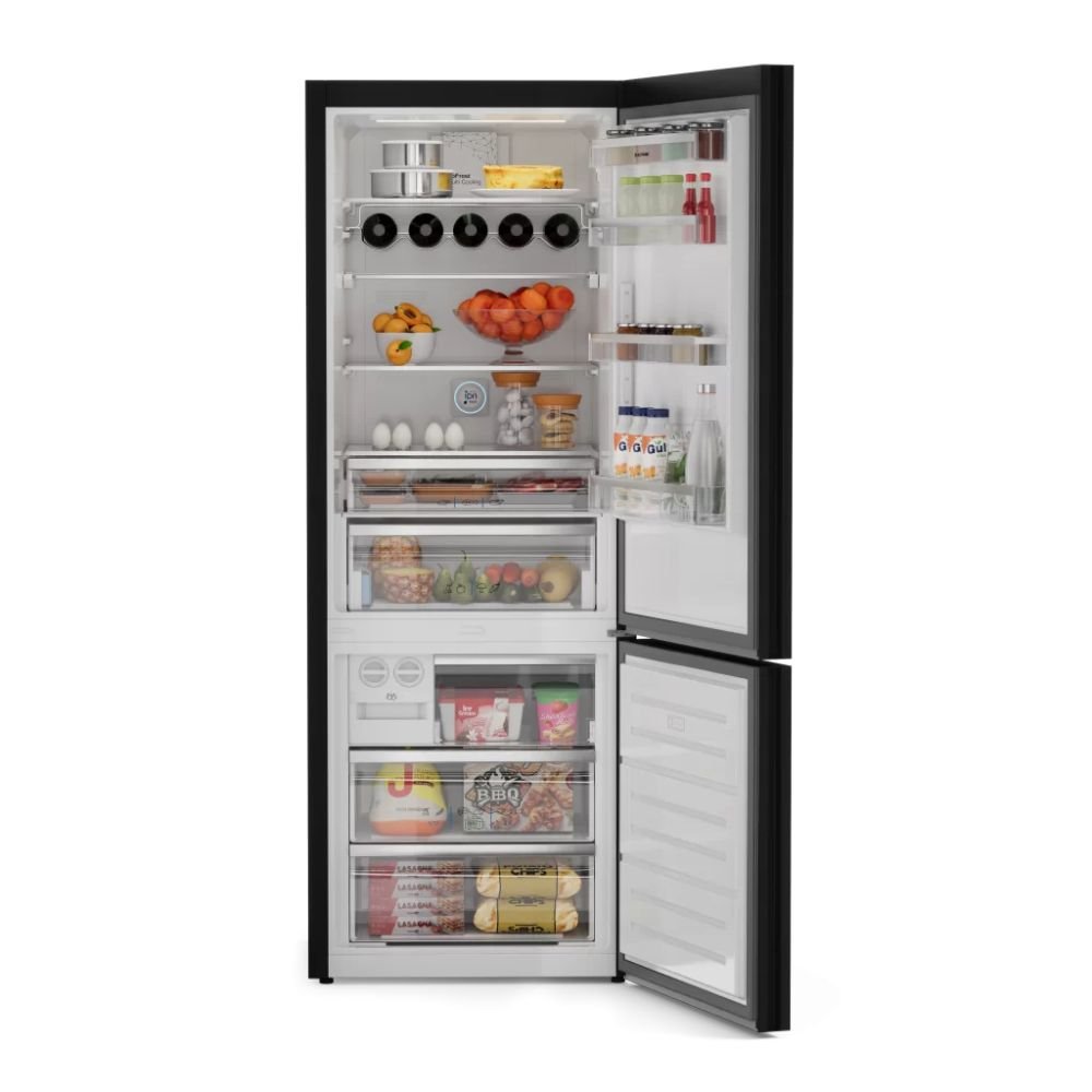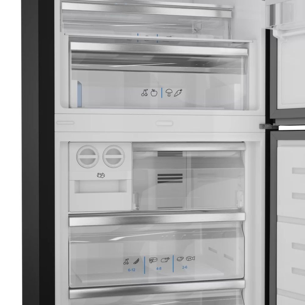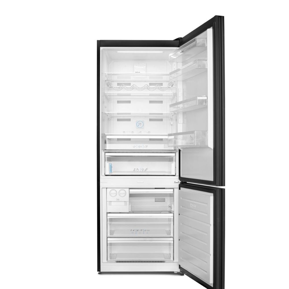 Com 510 litros, oferece espaço de sobra para organizar alimentos, bebidas e congelados com praticidade. Seu acabamento em vidro preto confere elegância atemporal, enquanto detalhes em inox e iluminação LED valorizam o interior. O layout inteligente inclui prateleiras ajustáveis e Z-Shelf retrátil, adaptando-se às necessidades de diferentes perfis de uso e projetos de cozinha modernos.