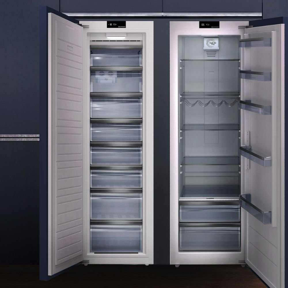 Projetado para embutir, o Duo utiliza dobradiças door-on-door que permitem montar o painel de revestimento diretamente na porta, assegurando alinhamento preciso com a marcenaria. O acabamento para revestir elimina frisos e emendas, oferecendo estética contínua e personalizada que valoriza projetos gourmet e facilita harmonização com materiais como madeira, pedra ou laca. Favorece instalação precisa, assegurando acabamento alinhado e sem folgas.