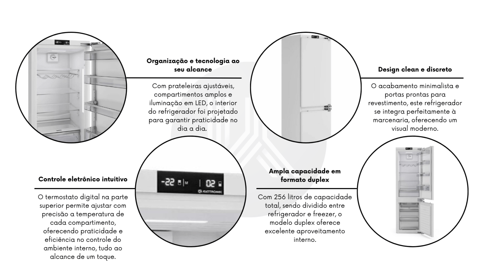 O Refrigerador Bottom Freezer para Revestimento da Elettromec é a solução ideal para quem deseja unir design sofisticado, tecnologia de ponta e versatilidade de projeto em cozinhas e espaços gourmets. Com acabamento pronto para receber revestimento personalizado, ele se adapta perfeitamente à marcenaria ou aos materiais do seu ambiente, integrando-se de forma harmônica à arquitetura do espaço.