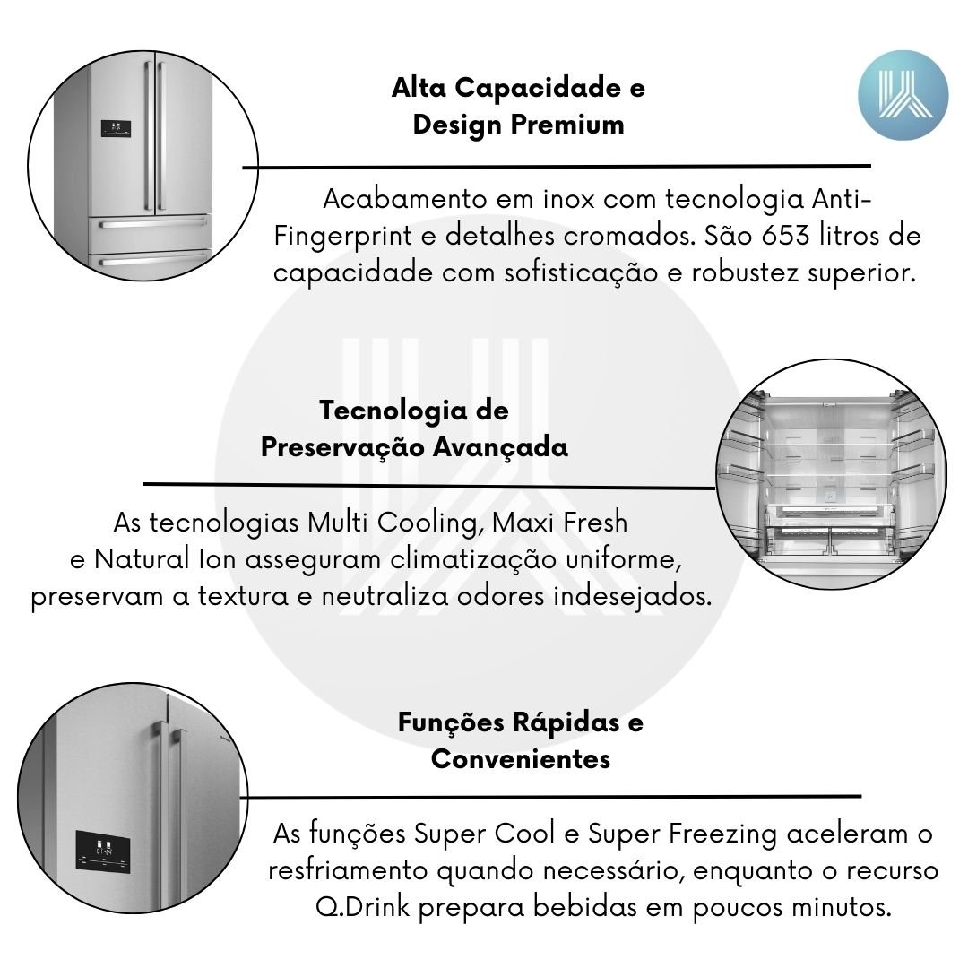O Refrigerador French Door 653 Litros une design sofisticado, grande capacidade e tecnologias de preservação para atender cozinhas exigentes. Compressor Inverter, Multi Cooling Tech e recursos como Zona Chiller, Maxi Fresh Preserver e Super Freezing mantêm alimentos frescos por mais tempo.