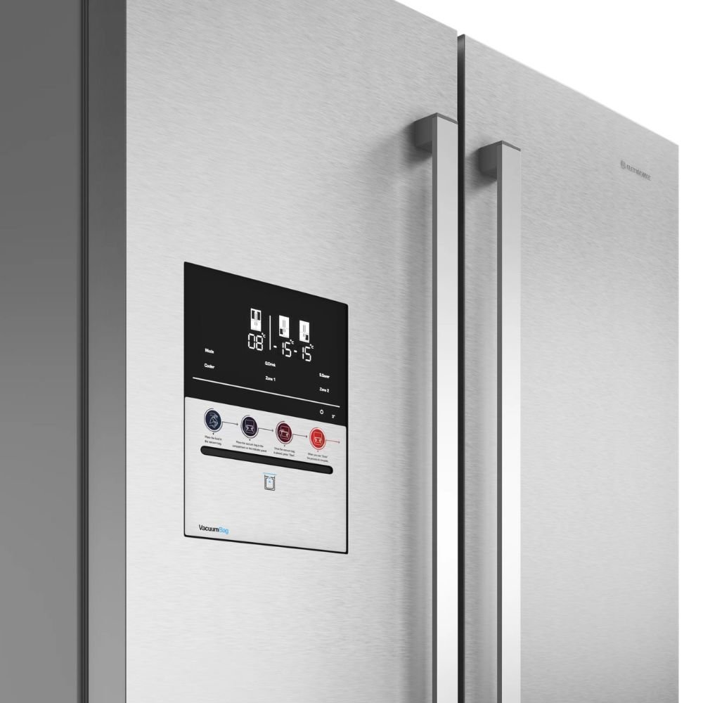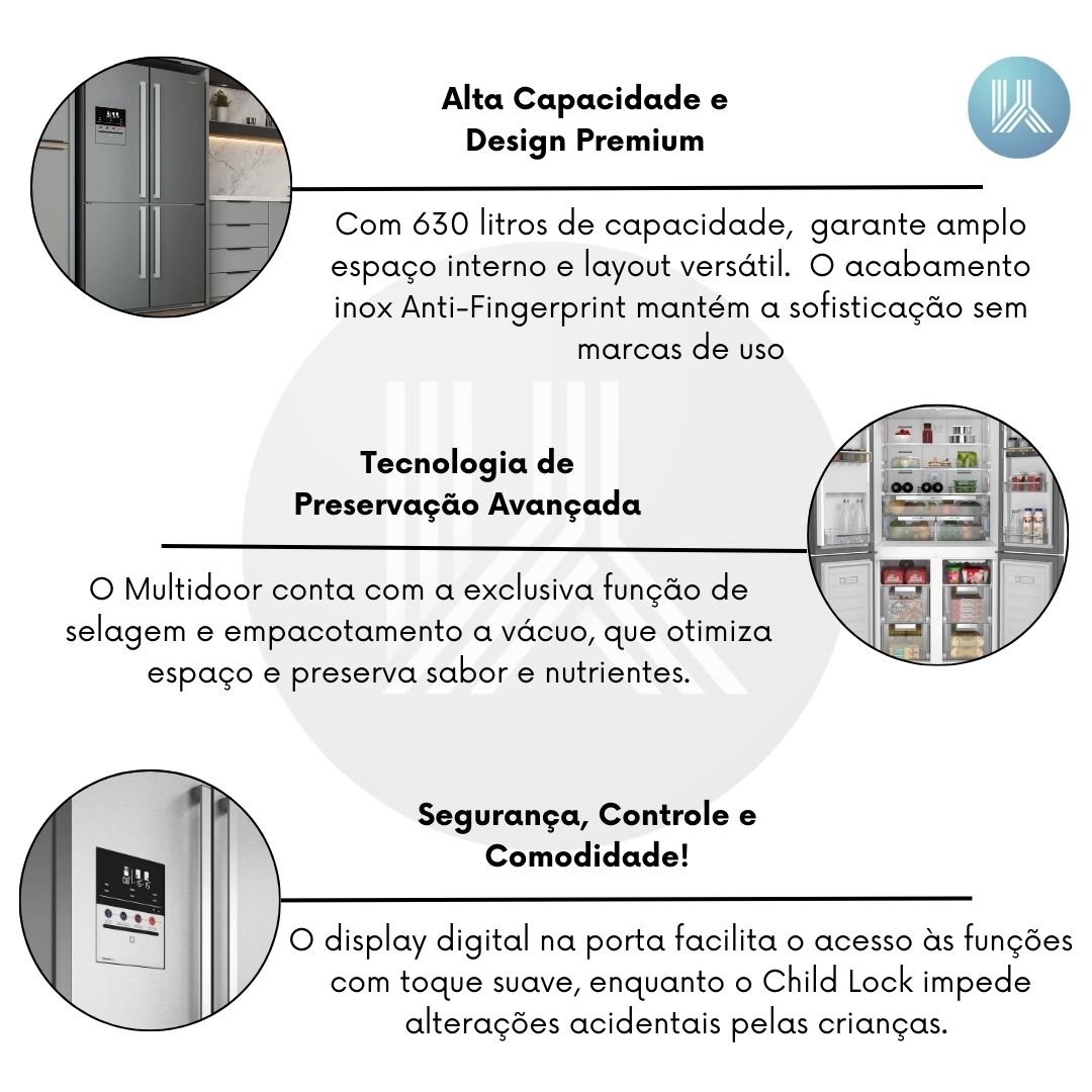 O Refrigerador Inox Multidoor 630 litros combina design sofisticado, alta capacidade e tecnologia de ponta para transformar a rotina da sua cozinha. Com acabamento em aço inox Anti-Fingerprint, oferece organização inteligente, funções exclusivas e recursos que preservam alimentos por mais tempo. Além de gavetas especiais, zonas independentes e compressor Inverter, ainda conta com sistema de selagem e empacotamento a vácuo integrado, trazendo inovação e praticidade incomparáveis.