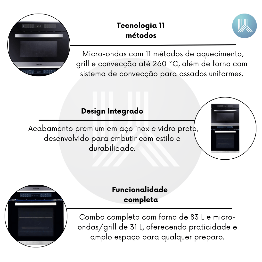 A Torre Combinada Cuisinart Arkton é a escolha ideal para quem busca unir sofisticação, tecnologia e versatilidade em um único conjunto. Composta pelo Forno Elétrico de 83 litros e pelo Micro-ondas Forno Grill Elétrico de 31 litros, ambos com design em aço inox e vidro preto, a torre se integra perfeitamente a cozinhas planejadas, oferecendo preparo uniforme, rápido e funcional para qualquer ocasião. Seja no dia a dia ou em eventos especiais, ela transforma o ato de cozinhar em uma verdadeira experiência gourmet.