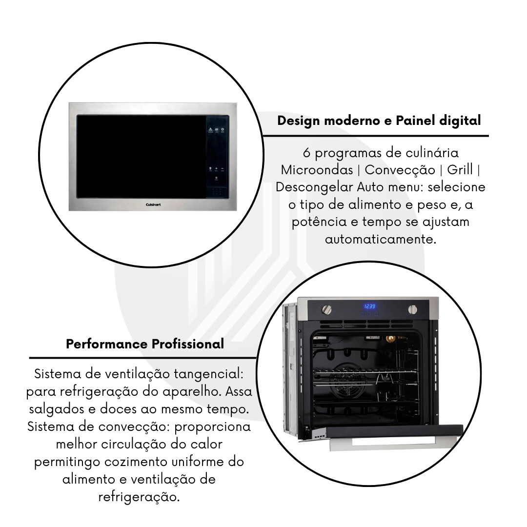 Sobre o Micro-ondas, Forno e Grill (31 Litros): O segundo aparelho é um potente Micro-ondas, Forno e Grill Digital de 31 litros. Extremamente versátil, conta com 6 programas de culinária, incluindo funções de Micro-ondas (5 níveis), Grill (2 níveis), Convecção (funcionando como um forno auxiliar), Auto Menu e programas combinados (como grill + micro-ondas). Seu painel é digital com timer e trava de segurança. Assim como o forno principal, a limpeza é facilitada, pois sua porta também pode ser removida e limpa com água quente e detergente líquido.
