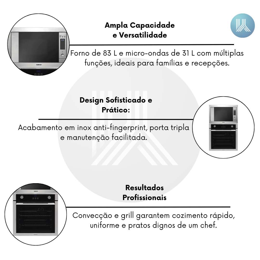 Múltiplas Funções: O forno conta com 8 programas, incluindo convecção, grill, forno + grill e espeto rotisserie, enquanto o micro-ondas oferece 8 programas de culinária, como convecção, grill, auto-menu e descongelar.