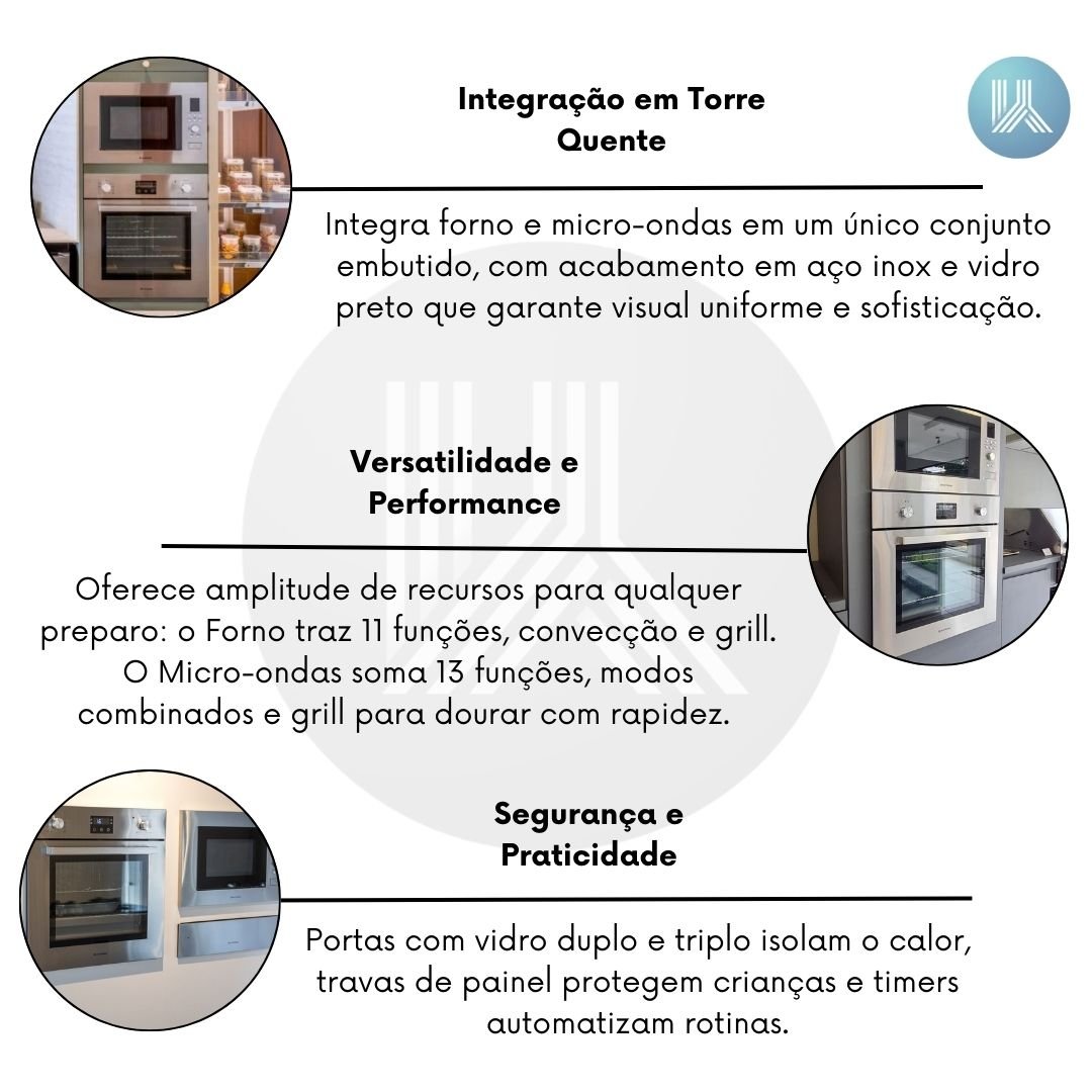 Projetada para integrar-se discretamente a móveis planejados, valorizando o projeto com acabamento em aço inox e vidro preto. A combinação do forno 60 cm e micro-ondas 23 L cria uma torre quente alinhada, com ventilação adequada e gabarito técnico para instalação. Resultado: estética contínua, fluxo de trabalho otimizado e maior valorização do ambiente. Ideal para torre quente, compatível com gaveta aquecida.