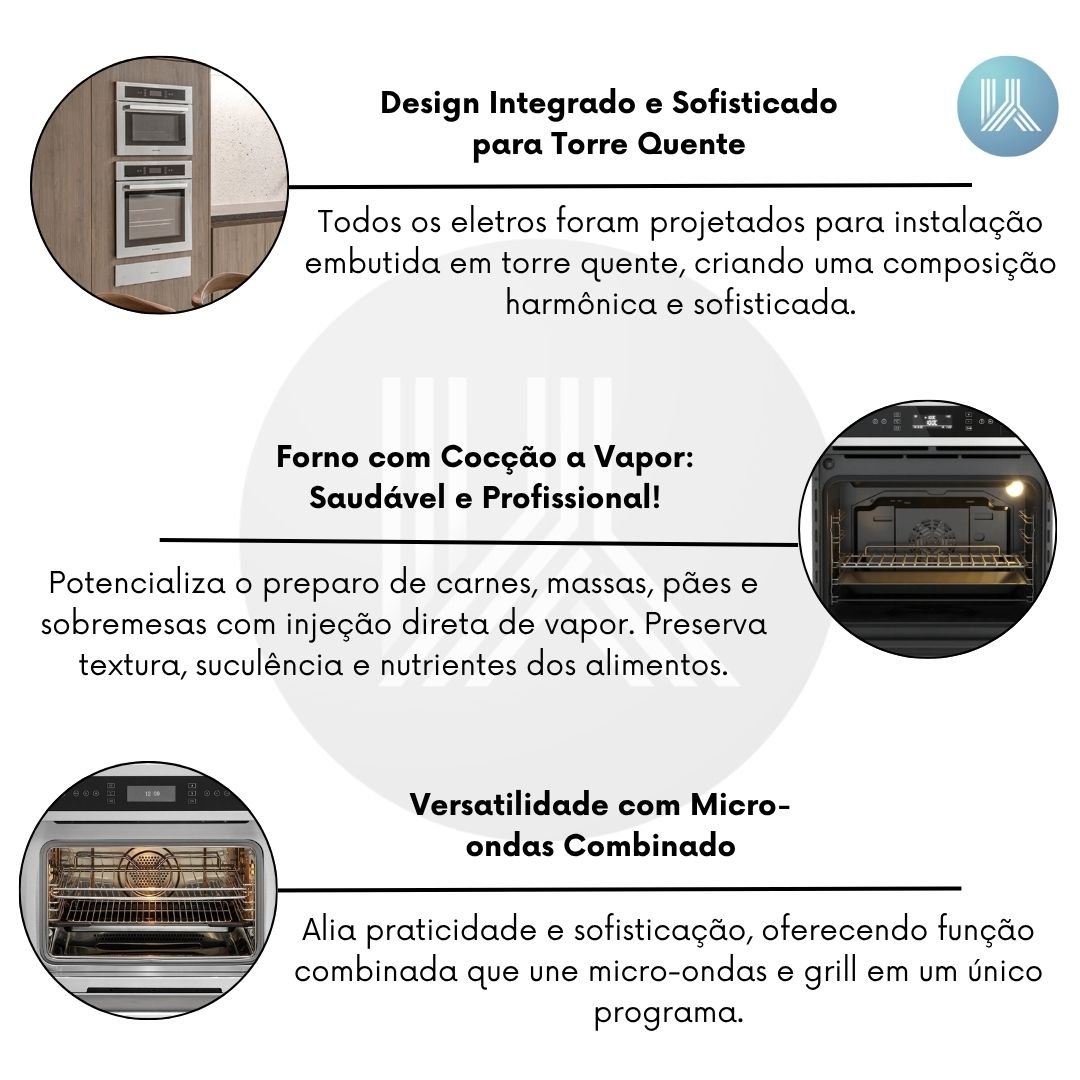 Todos os eletros foram projetados para instalação embutida em torre quente, criando uma composição harmônica e sofisticada. O acabamento em inox aliado ao vidro temperado reflete modernidade e valoriza o ambiente. Além da estética uniforme, a combinação otimiza espaço, oferece praticidade no dia a dia e eleva a experiência gourmet com tecnologia de ponta, robustez e desempenho confiável.