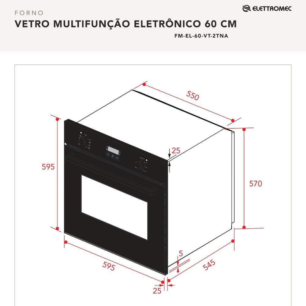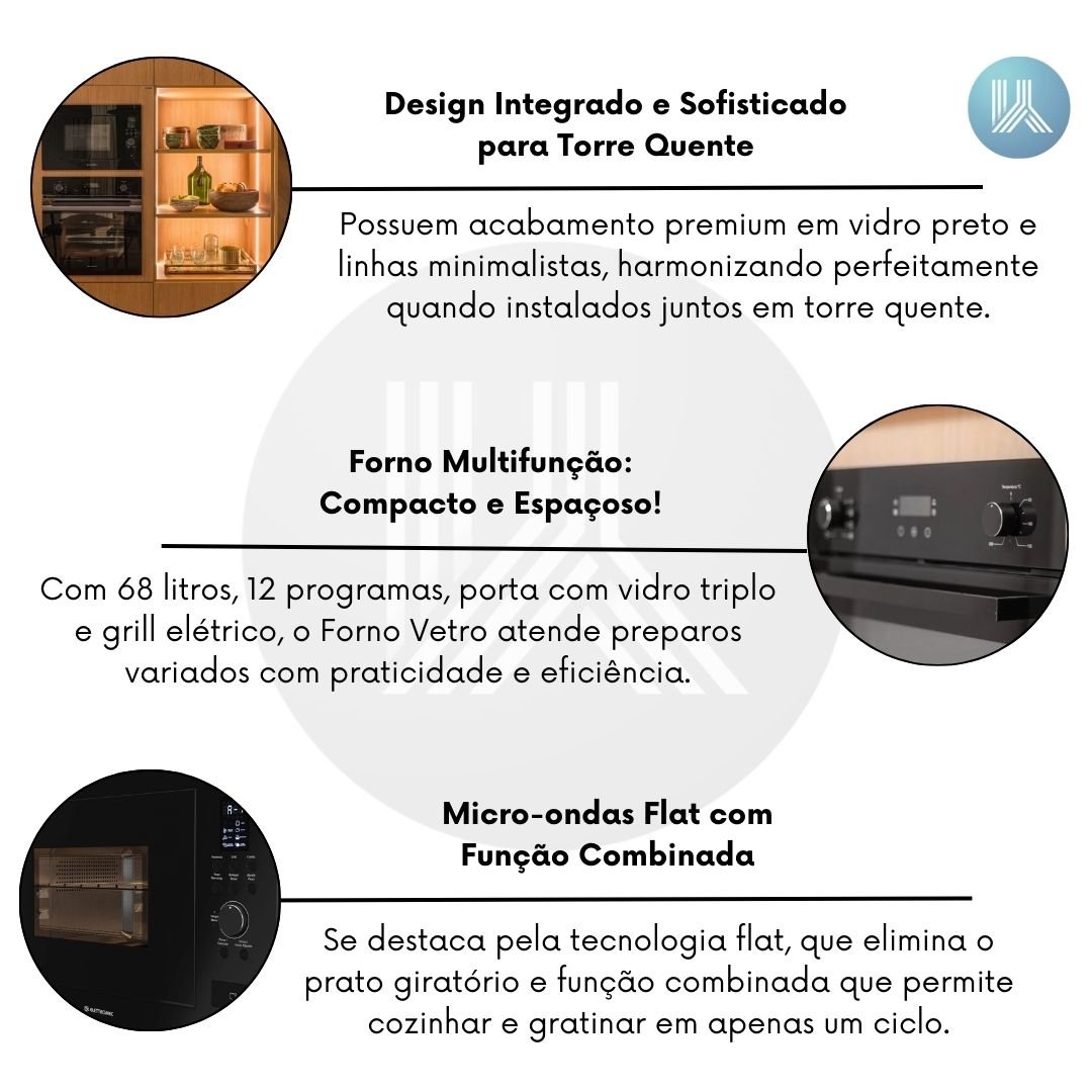 Micro-ondas de Embutir Vetro Elettromec Função Combinada 23 Litros 220V Quant: 1xForno Elétrico de Embutir Vetro Elettromec Multifunção Eletrônico 68L 60cm 220V Quant: 1x - Garantia: 2 anos