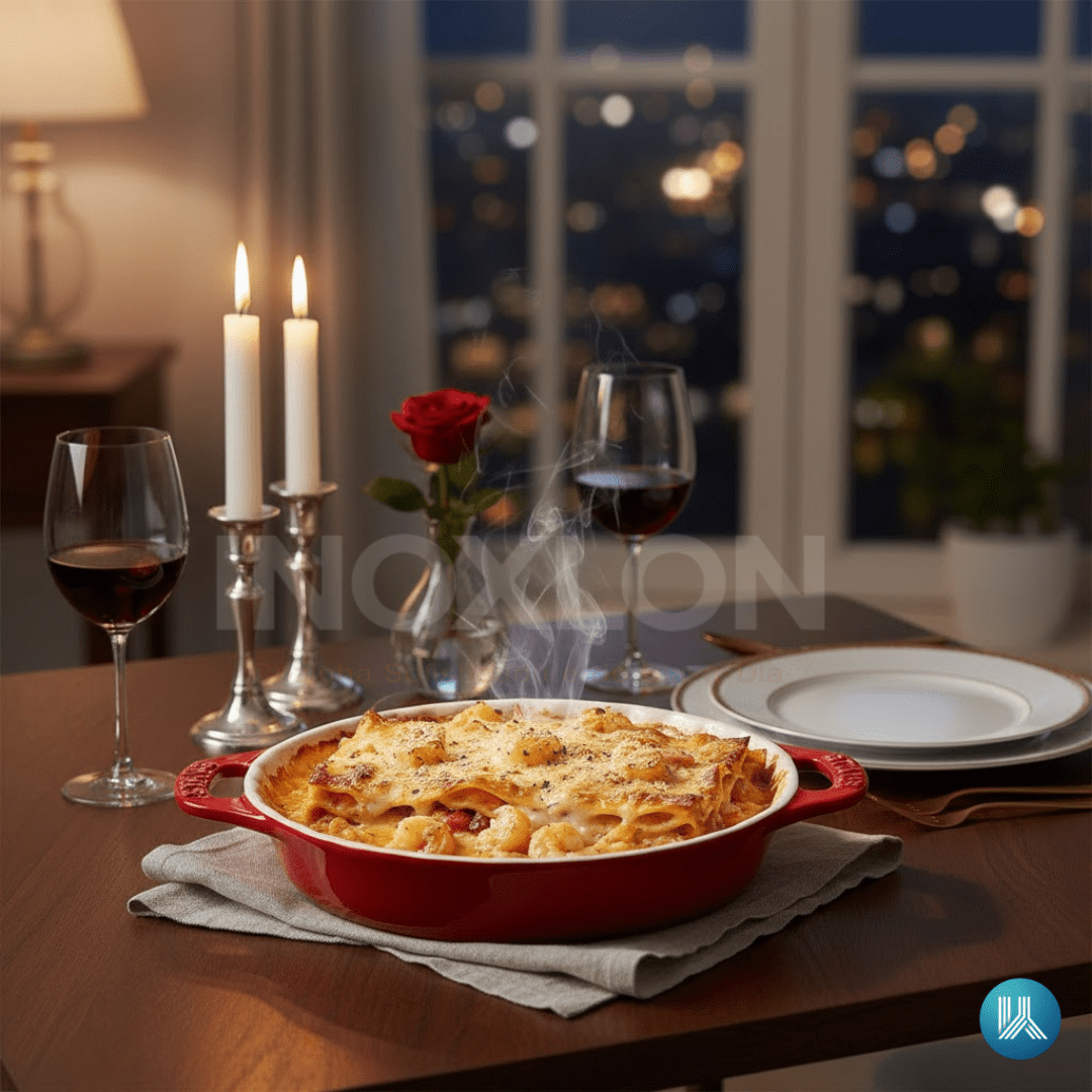Estética de Destaque (Vermelho Cereja): O recipiente com cores vivas e acabamento em esmalte é um diferencial de luxo que transforma a travessa em uma peça de apresentação que transita lindamente para a mesa.